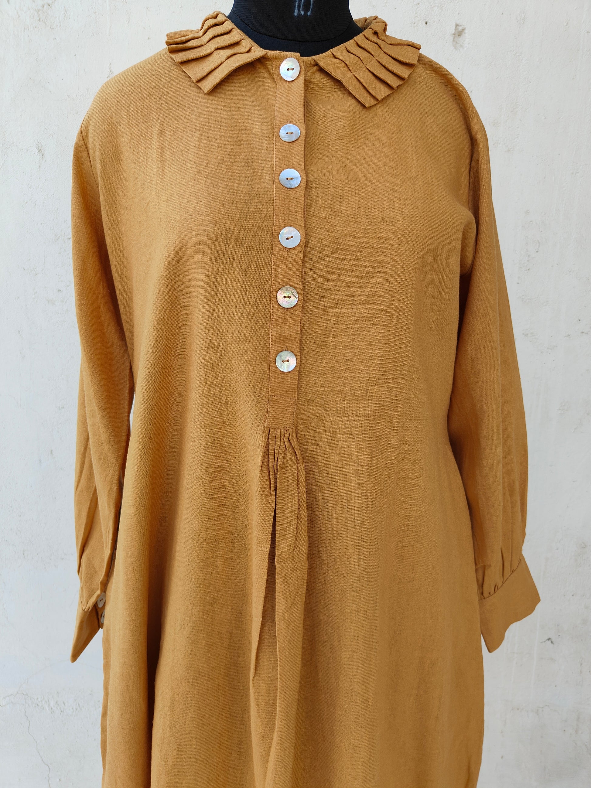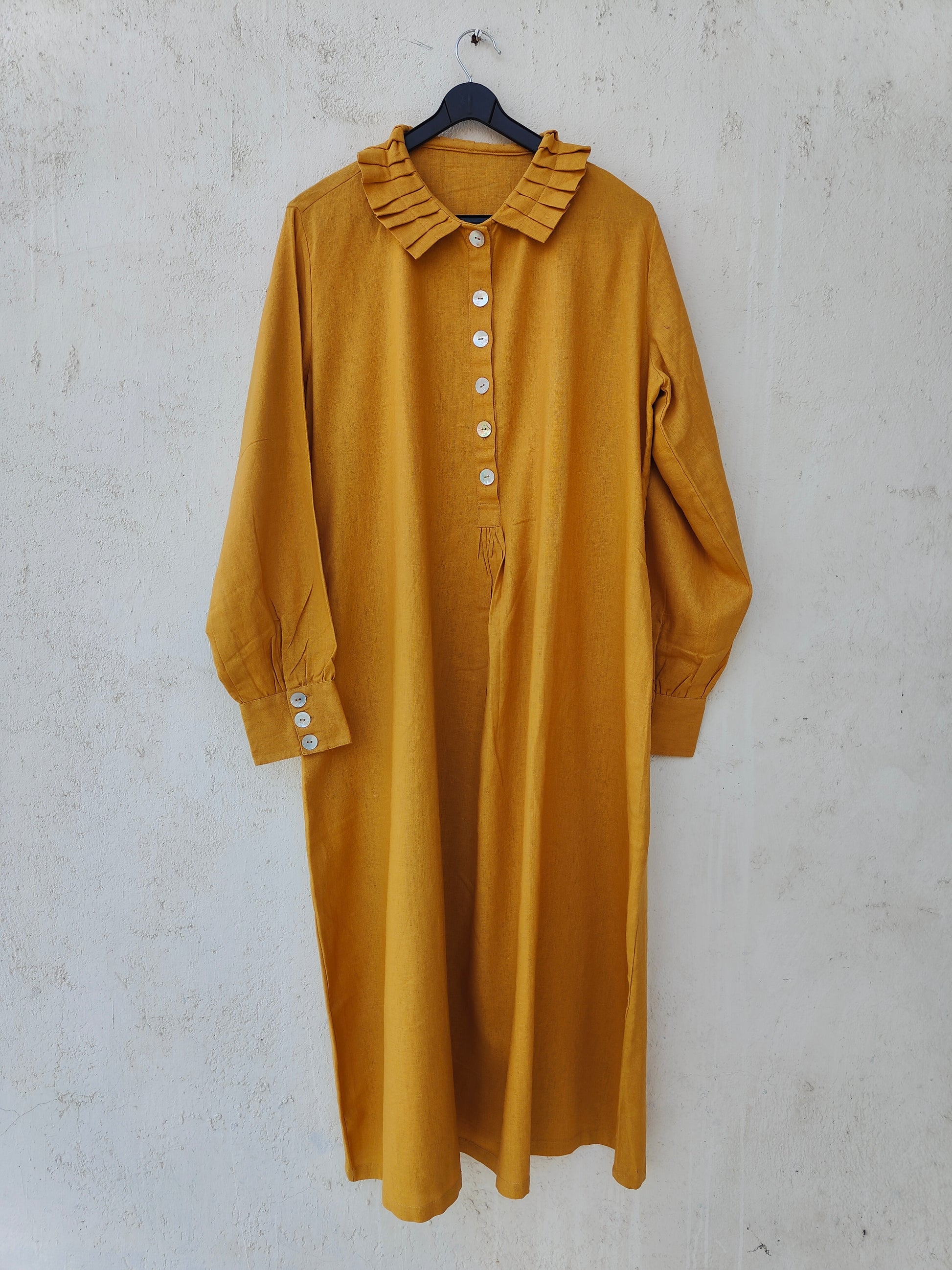 Slipping into the warmth, this dress boasts a subtle yet striking Pleated neckline, with buttons that gracefully cascade down to the chest and the cuffs of the sleeves. Featuring two side pockets.